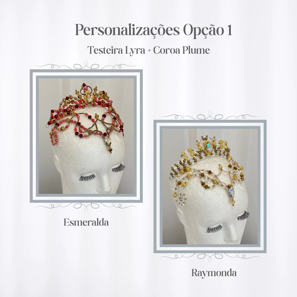 Ele inclui a Coroa Plume — modelo com cristais, pedrarias e vidrilhos — e a opção de escolher entre duas testeiras para compor o look ideal: